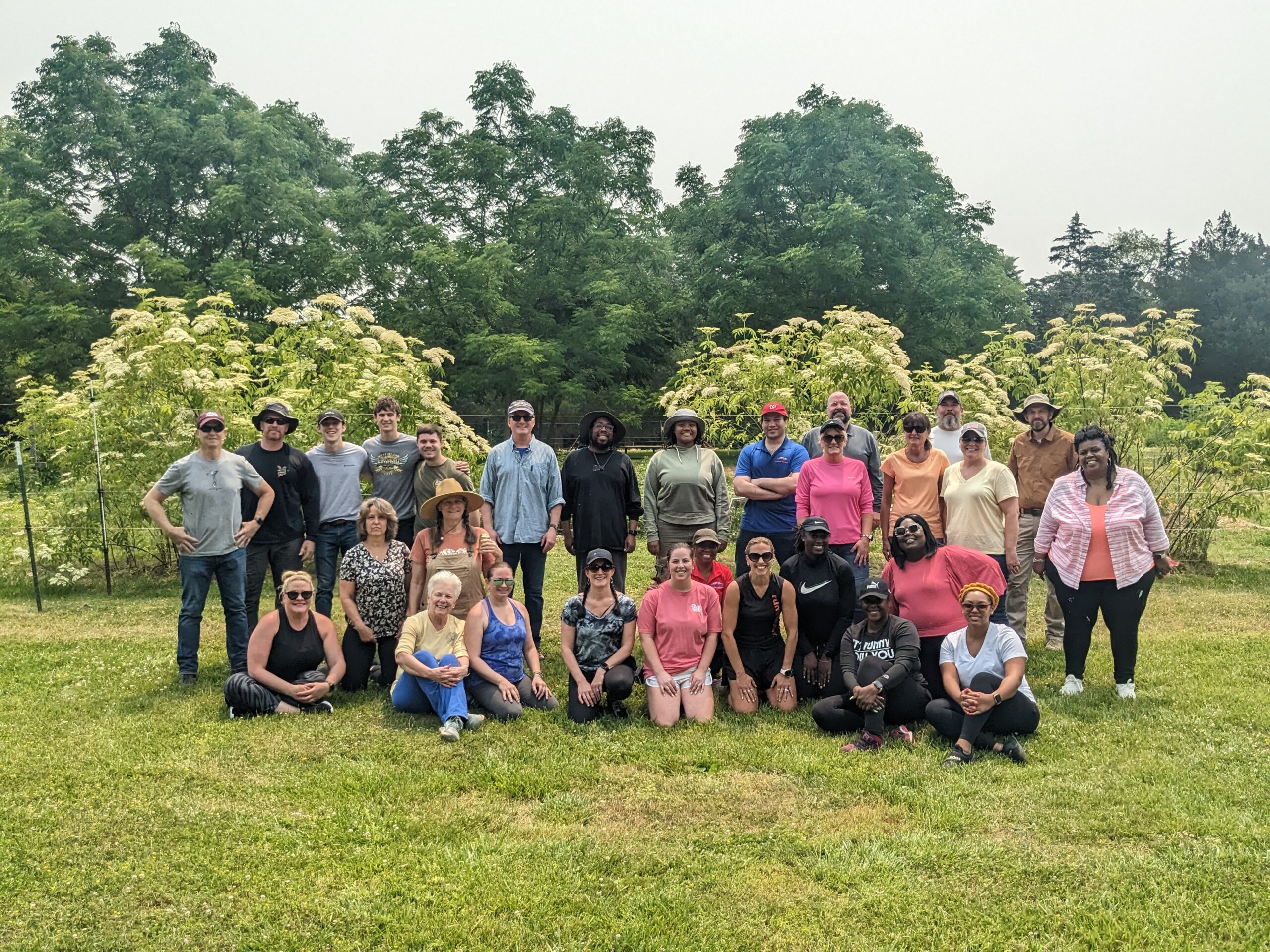 - A group of people poses for a photo outdoors, with trees and flowering bushes in the background.