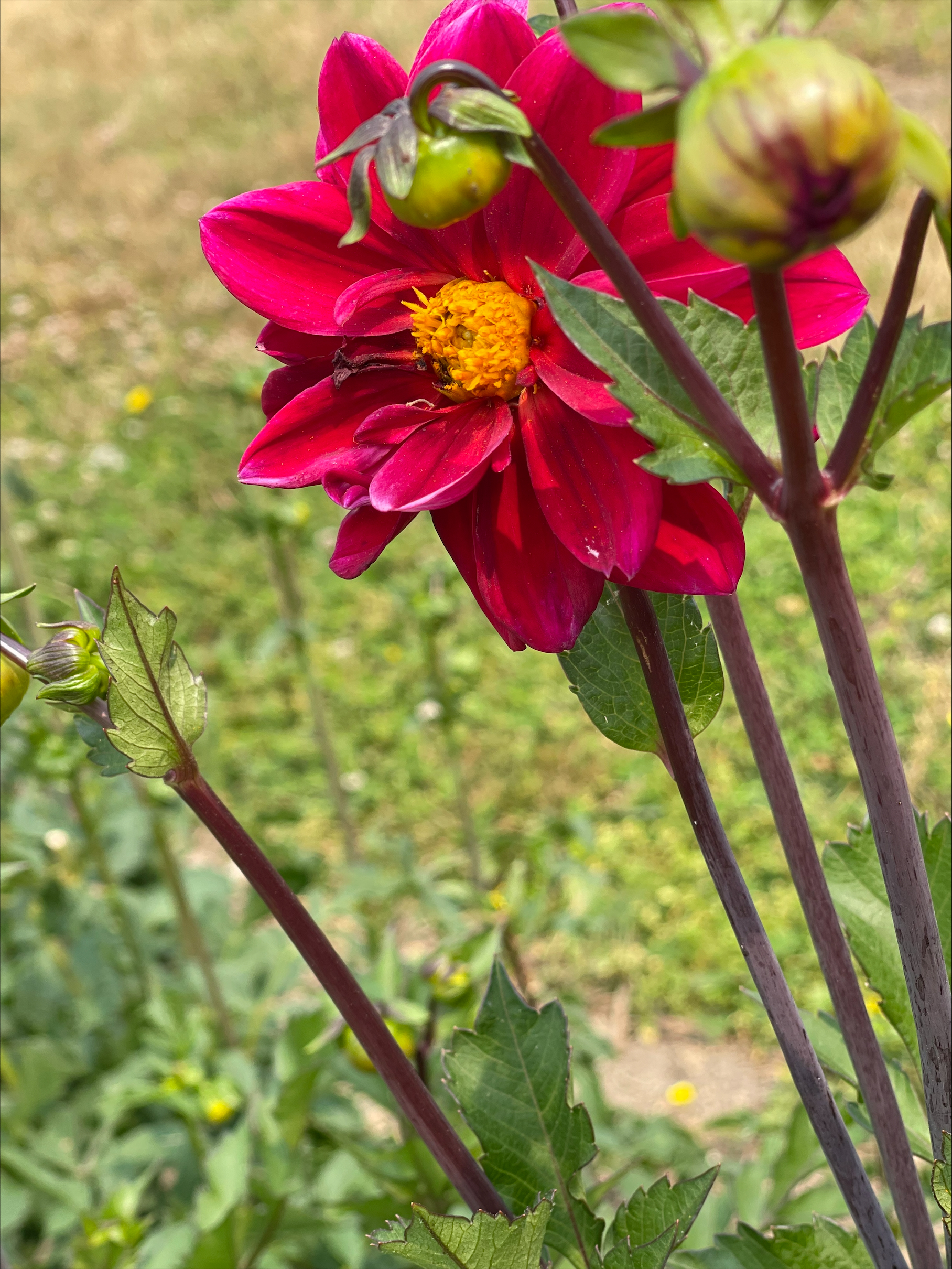 - A close-up photograph of a red dahlia flower with a dark insect on its petals, set against a blurred background.