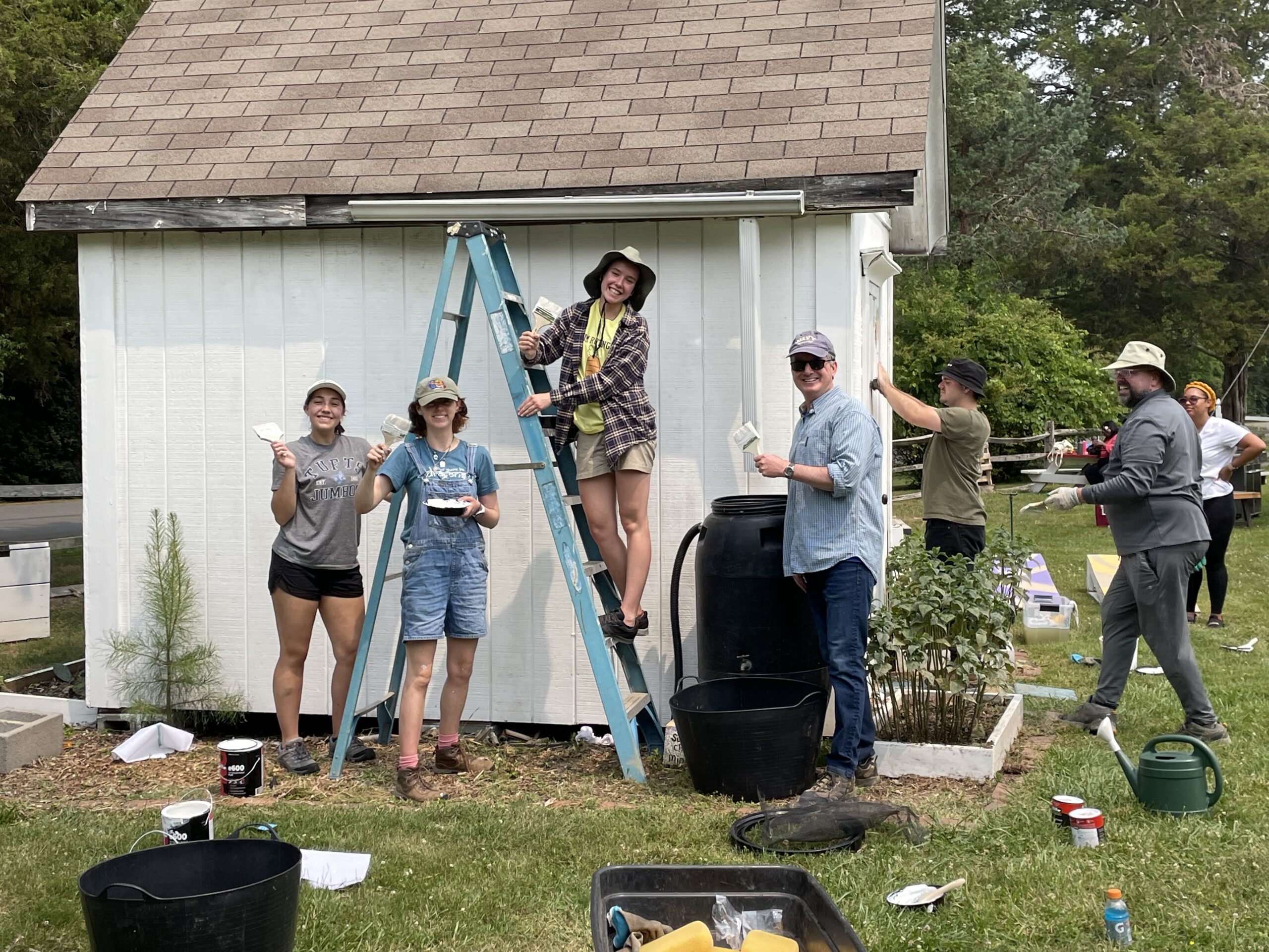 - A group of volunteers is shown painting a white shed outdoors on a sunny day.