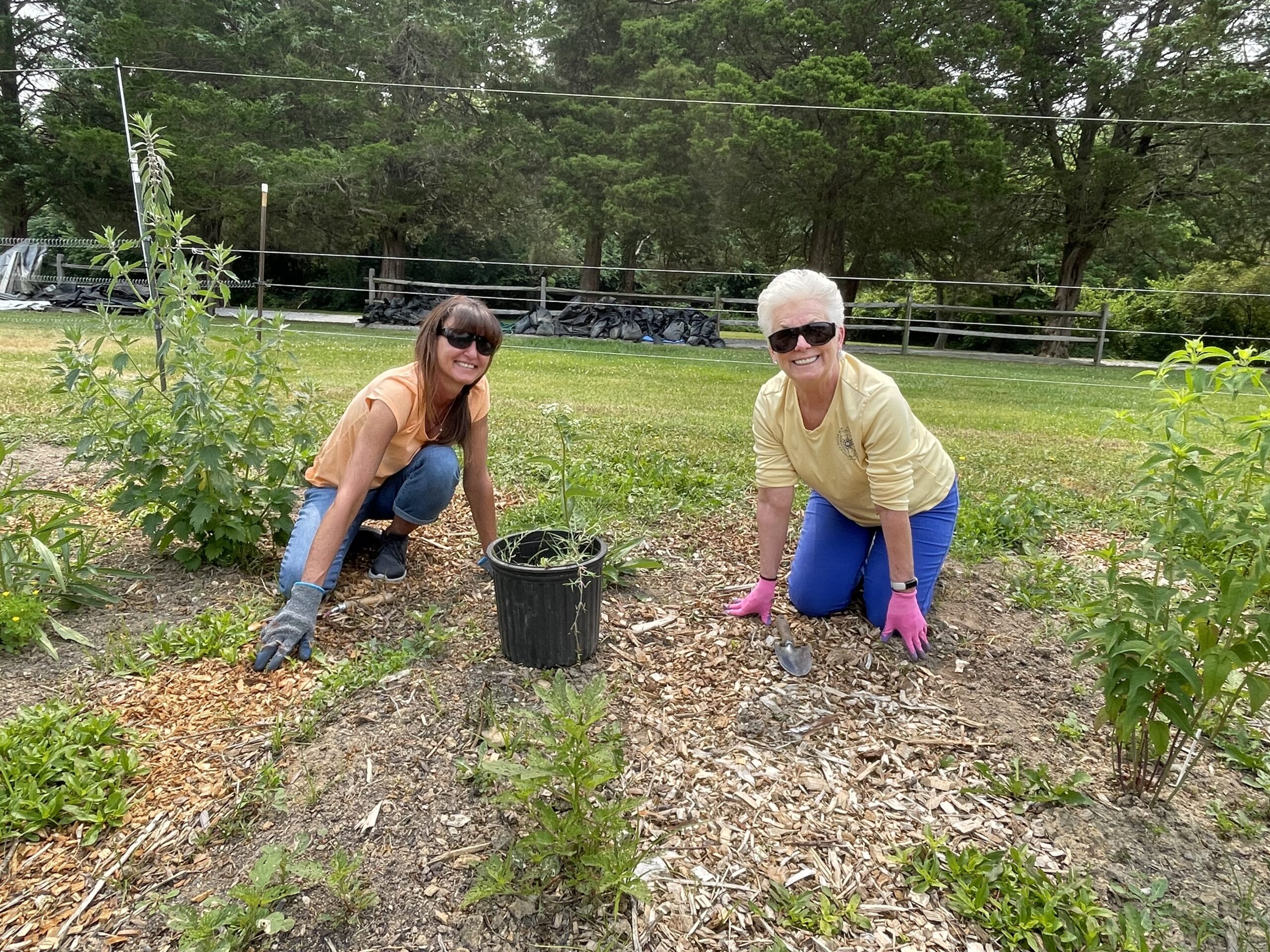 - Two women are shown working together in a garden, tending to plants in a sunny outdoor setting.
