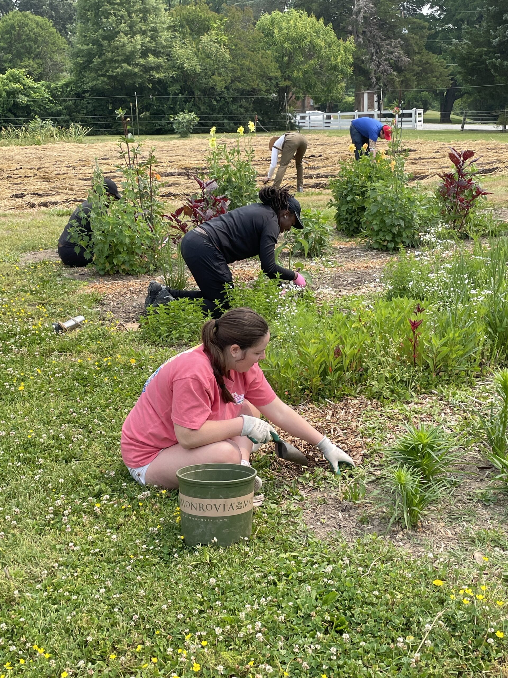 - Volunteers tend to plants in a community garden, with one person using a bucket labeled “MONROVIAM”.
