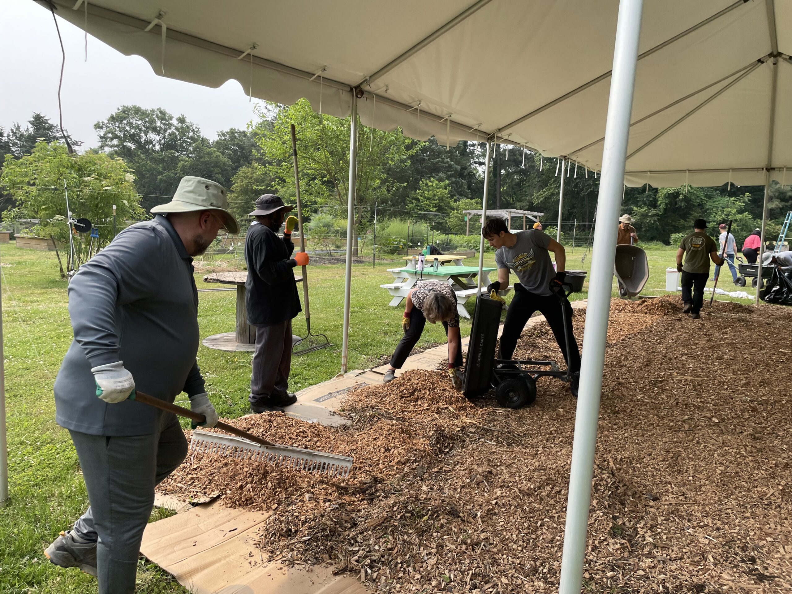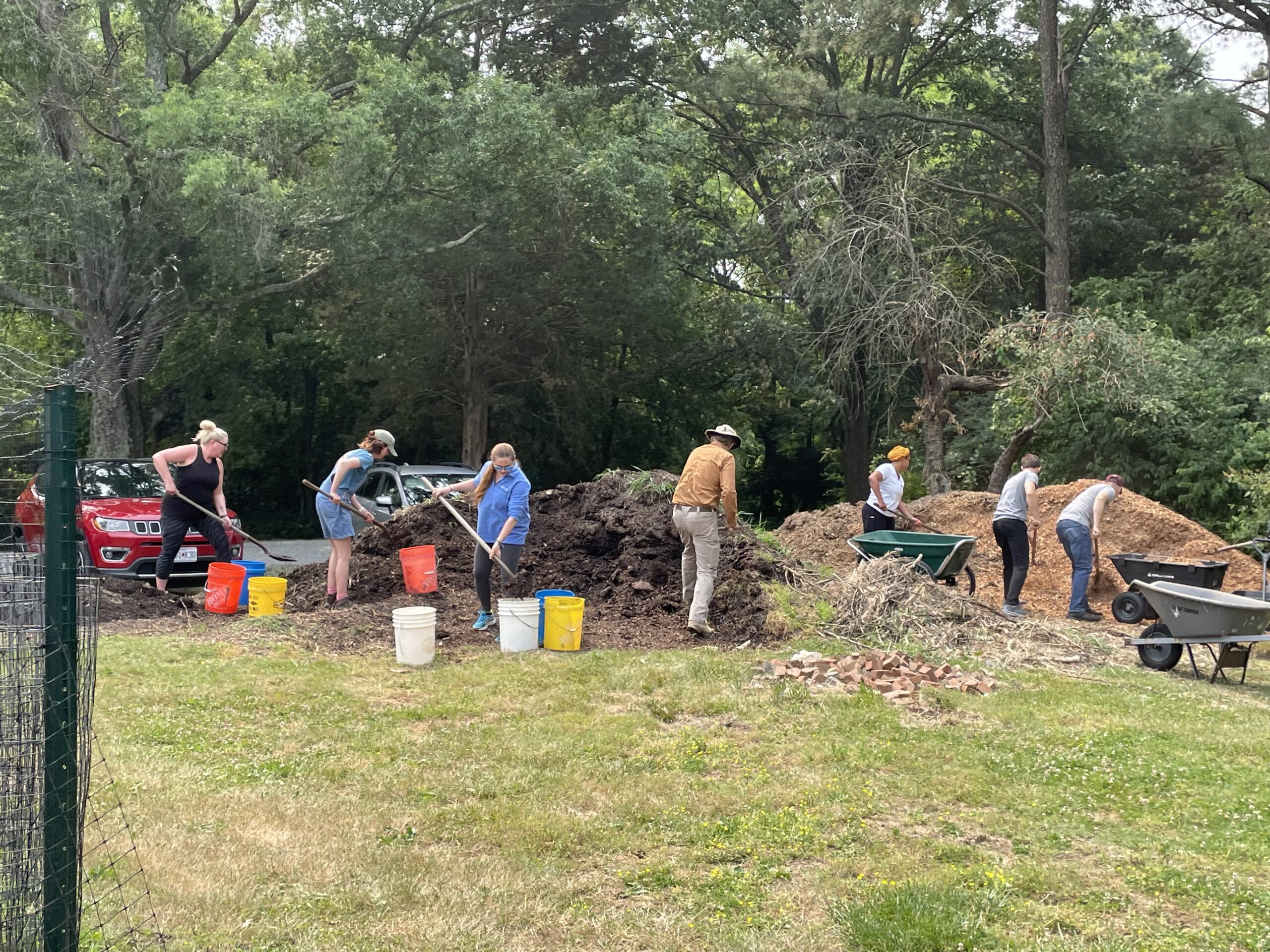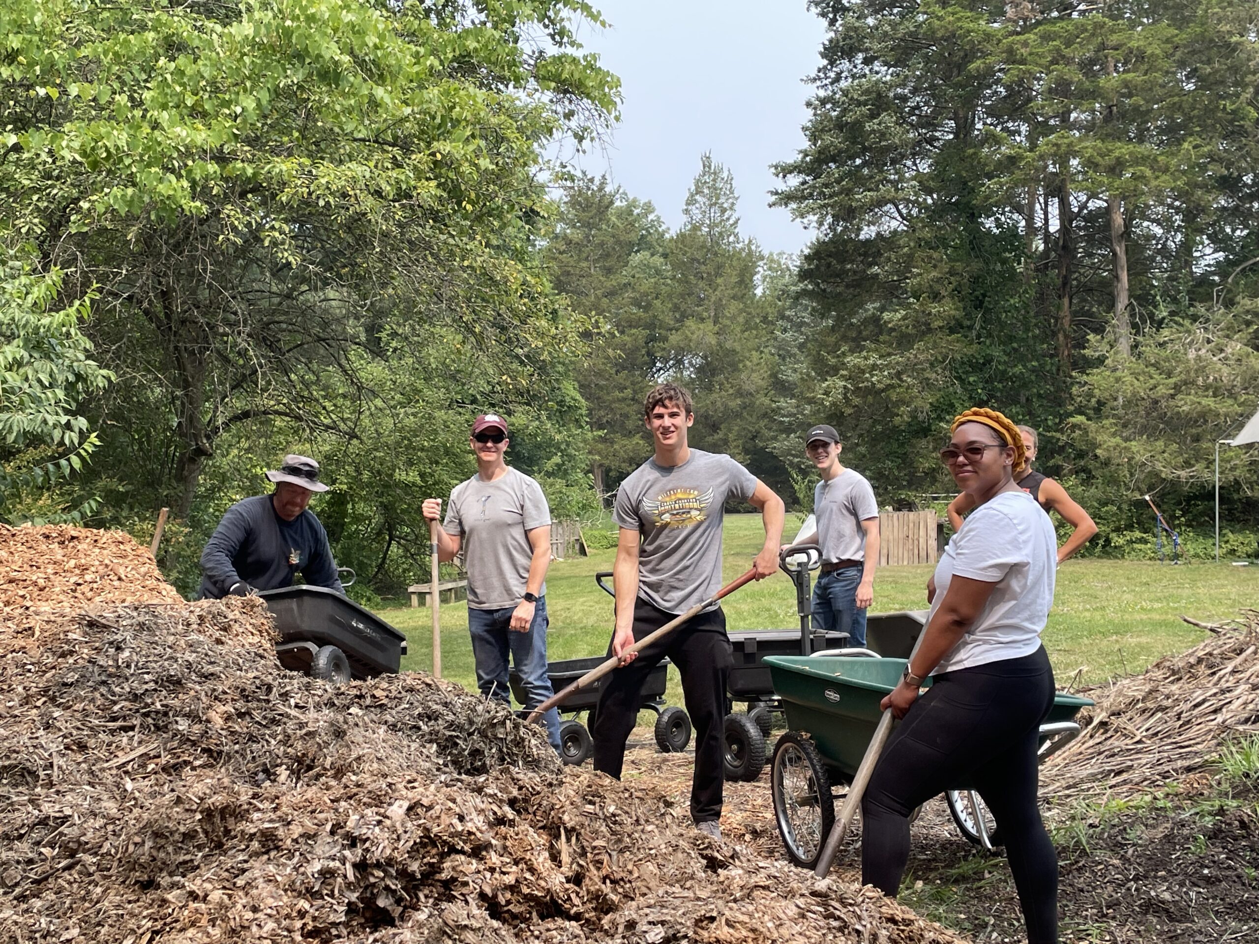 - A group of volunteers works together on an outdoor project, moving mulch and soil in a grassy area with trees.