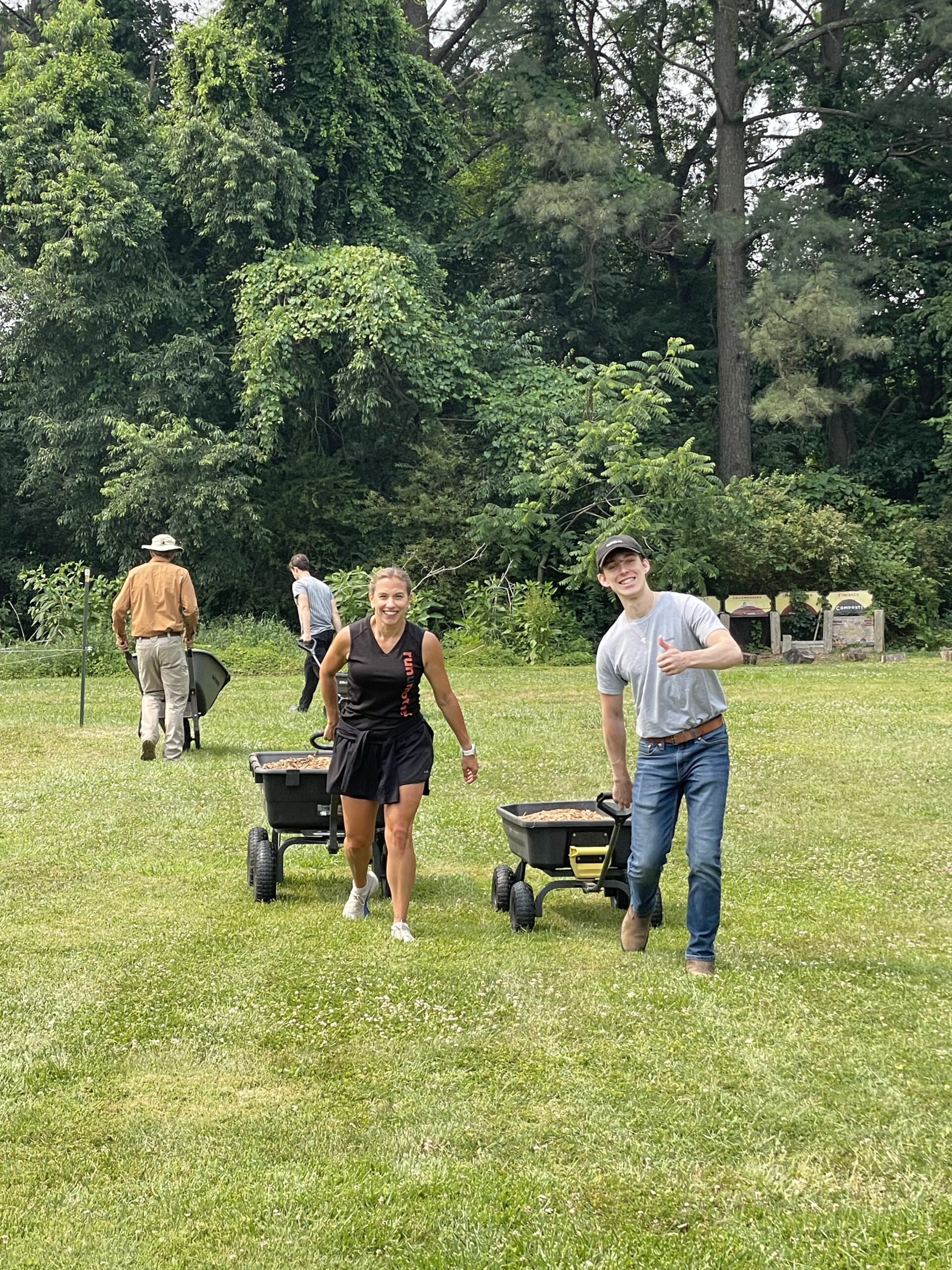 - Two volunteers move carts filled with mulch across a grassy field, with other volunteers working in the background.