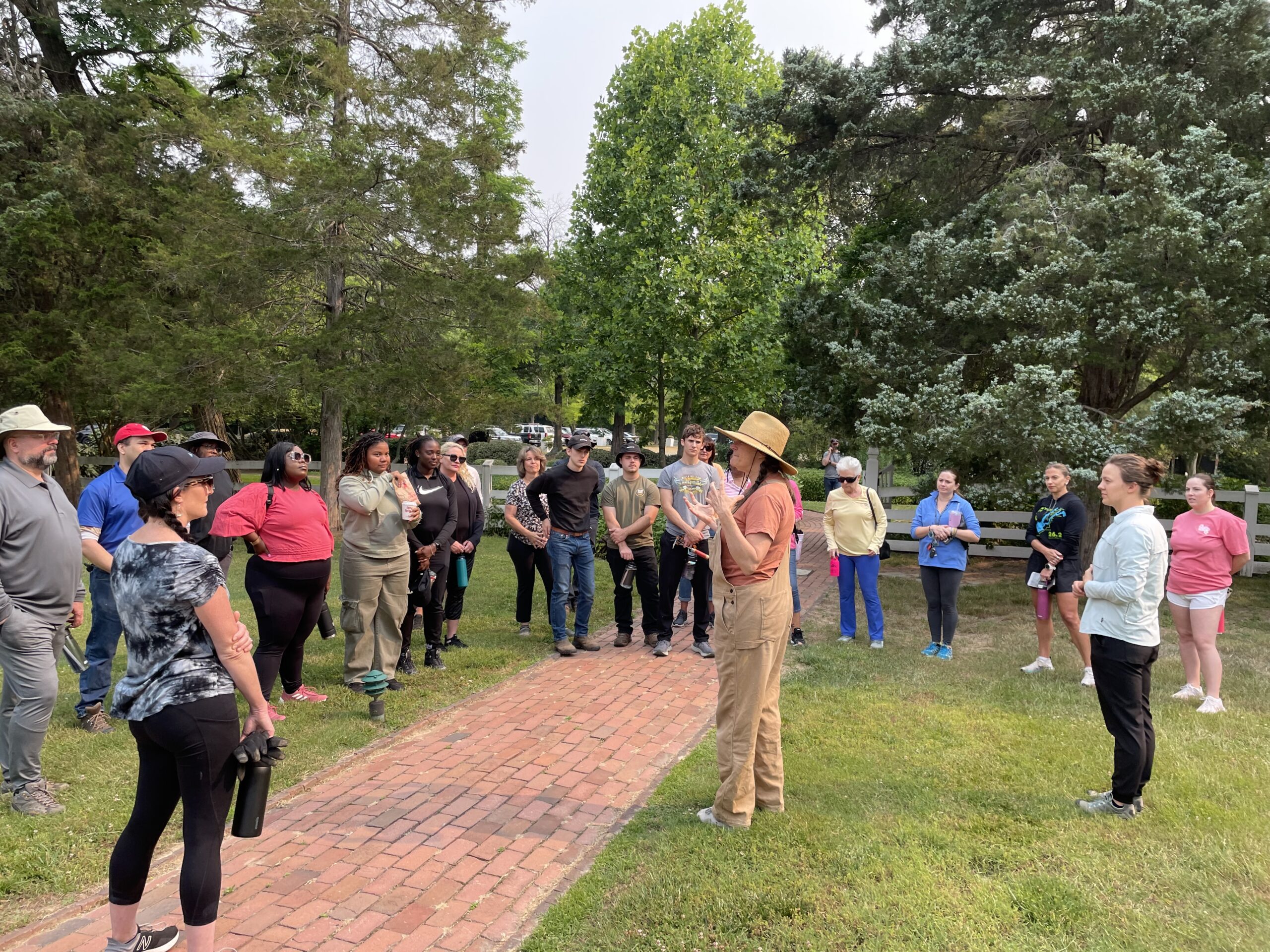 - A group of people listens to a speaker on a brick pathway in a grassy outdoor setting.